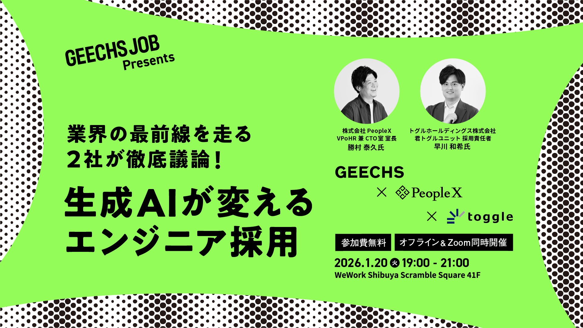 今回は「生成AIが変えるエンジニア採用の最前線」をテーマに、不動産開発のデジタルインフラ事業を手掛けるトグルホールディングス株式会社から君トグルユニット 採用責任者の早川 和希氏、採用から活躍支援までAIで人事課題を解決する株式会社PeopleXからVPoHR 兼 CTO室 室長の勝村 泰久氏にご登壇いただきます。